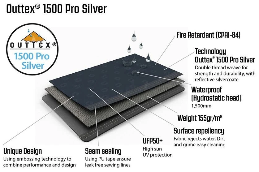 | Tente extérieure | Outtex® 1500 pro d'argent, 100% polyester; |